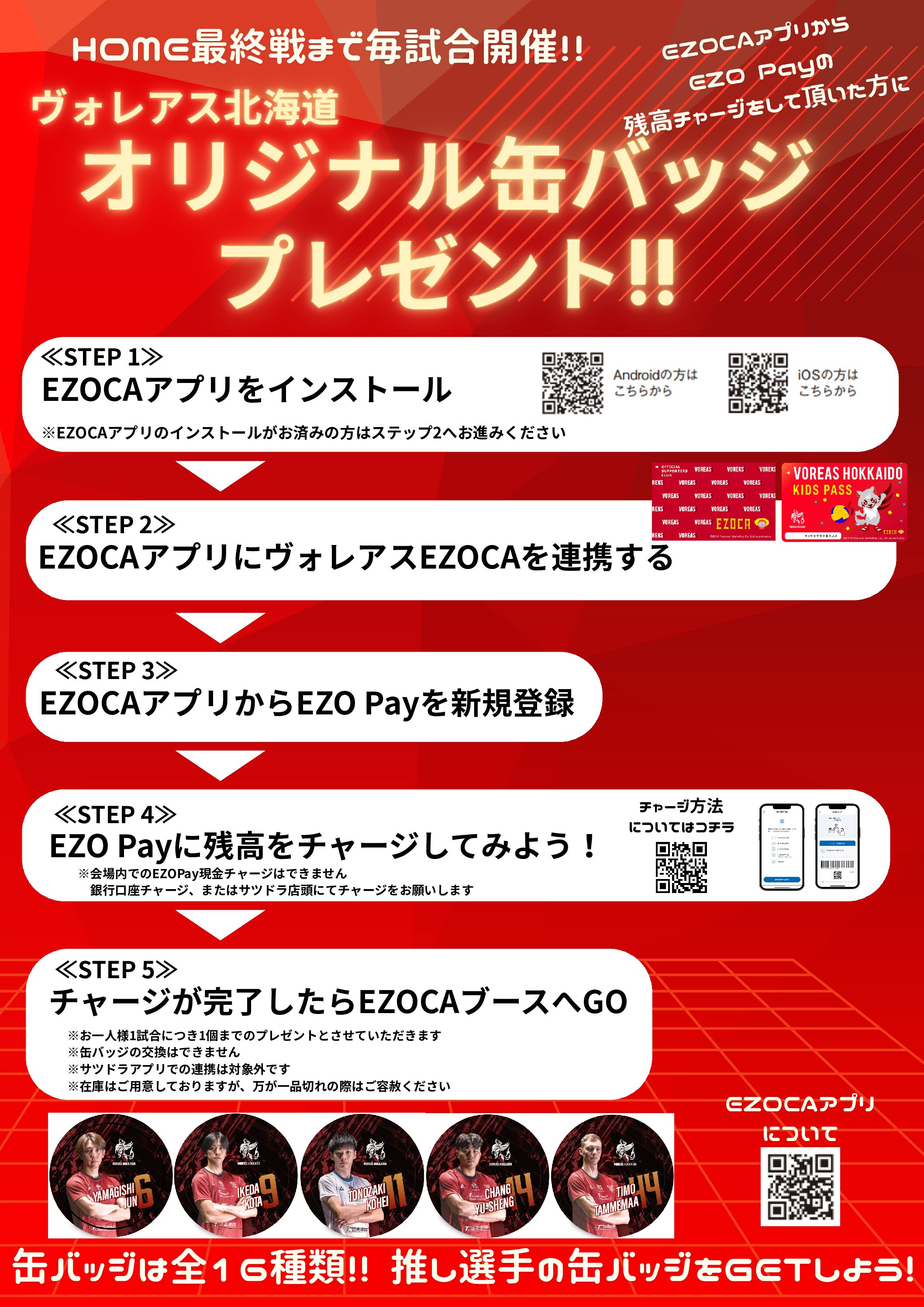 函館大会より実施しているオリジナル缶バッジがもらえる「EZO Pay登録キャンペーン」について、今週末の試合より新たにSTEPを追加して実施することが決定しました!